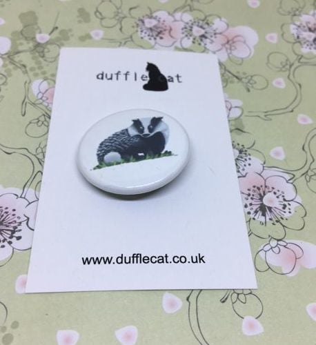 A quirky badger badge. Standard, 3cm (1.25") Round Badge, Covered with scratch and UV-resistant Mylar. Metal and plastic. With a steel pin back.