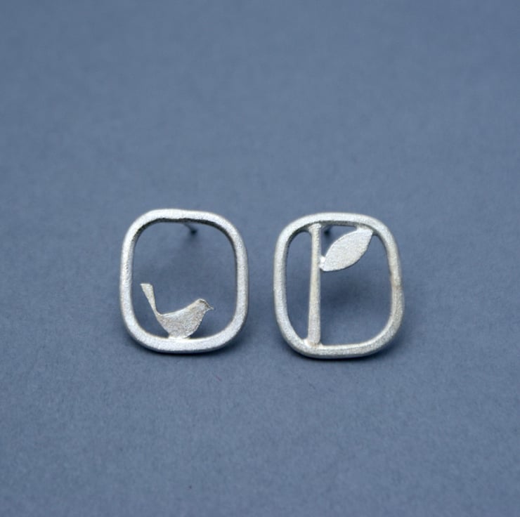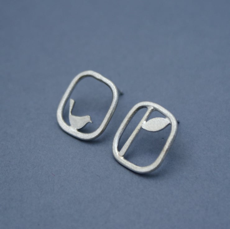 A lovely pair of mis-matched earrings that can be worn for daytime or evening. The earrings feature a stylised tree with a little leaf on one side and a bird on the other side. Soldered within a hand forged irregular square for an organic feel and finished with a lovely frosted texture which has a subtle sparkle and is slightly rough to the touch.