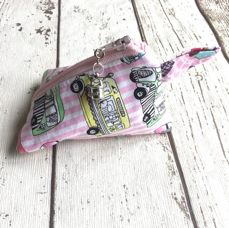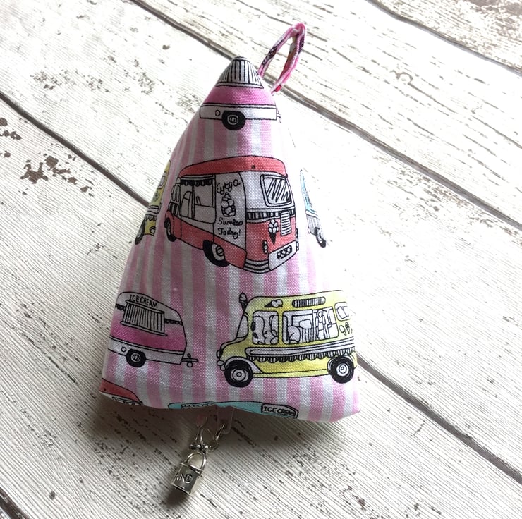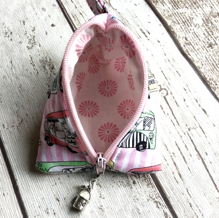 This cute little purse is just the thing to hold your coins for holiday treats. Created from a pink and white stripped cotton with a design of ice cream vans detailed in black and coloured in shades of pink, green, yellow and blue. The pink zip has a detachable silver coloured metal charm in the shape of a bucket and spade.