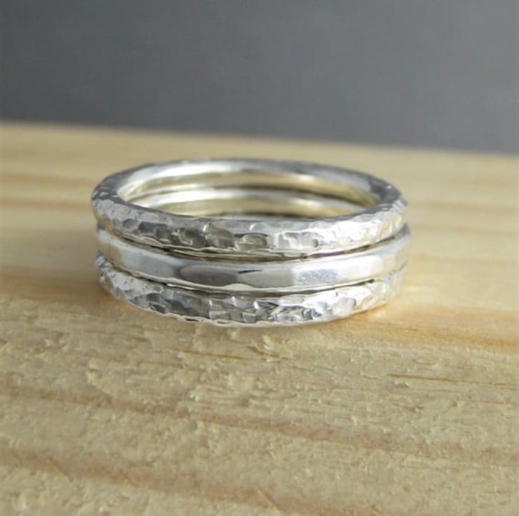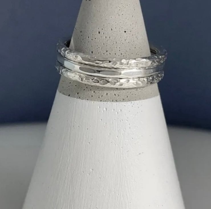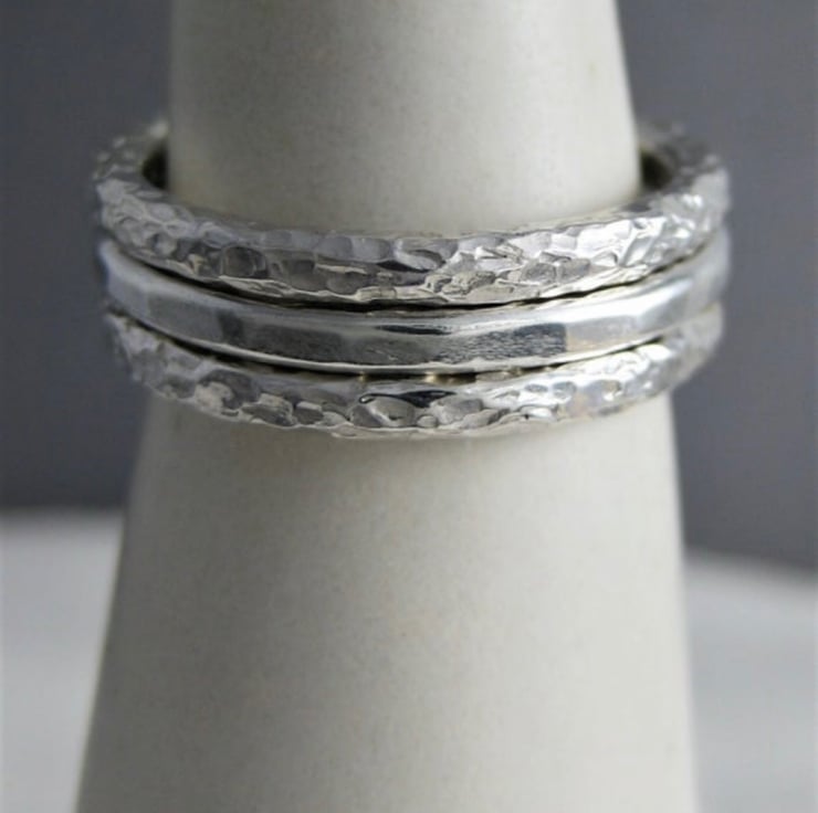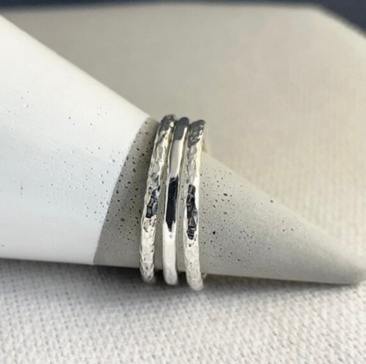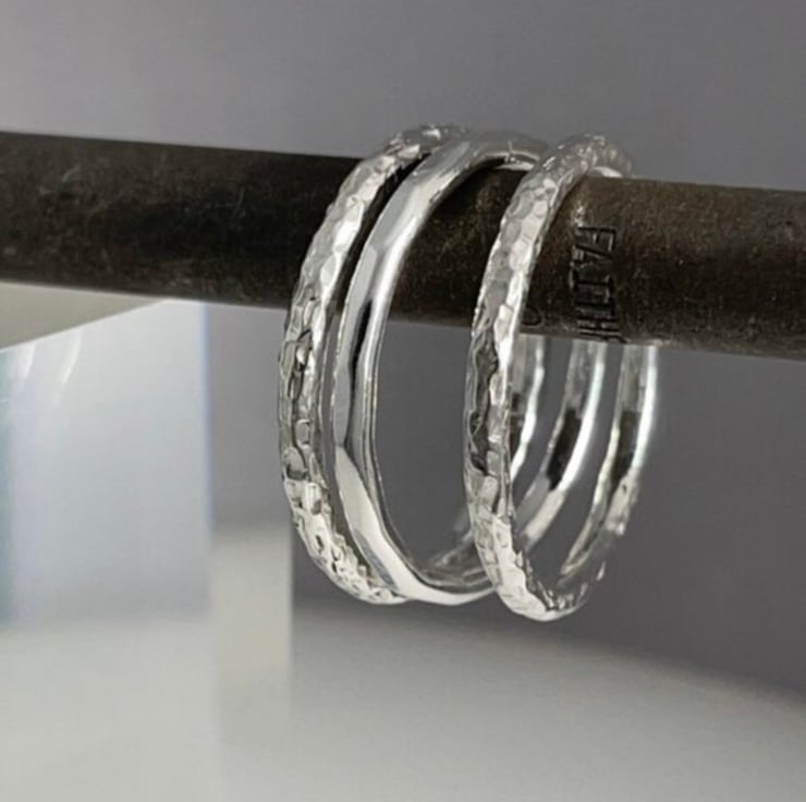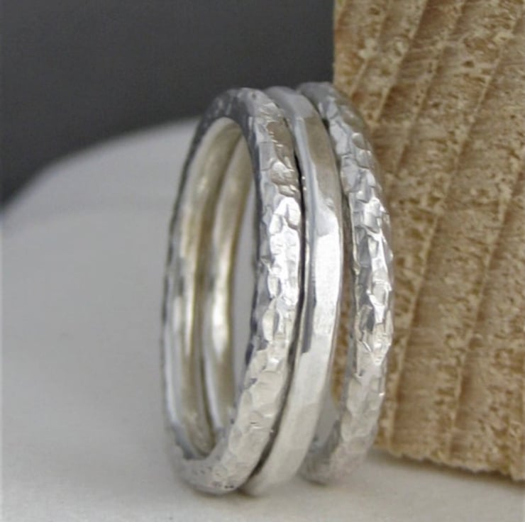 A lovely set of three stacking rings handmade from 925 Sterling silver. Cut by hand from 2mm thick silver round wire, formed into rings then two hammered to create a sparkly textured surface and the third hammered with a contrasting faceted surface.