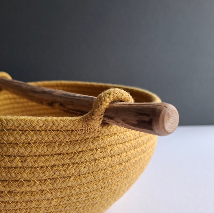 Handmade from coiled 6mm cotton rope and stitched on my sewing machine, this bowl has been finished with a handle formed from a piece of driftwood that I collected from the local beach. The handle has then been cut to size and sanded smooth.