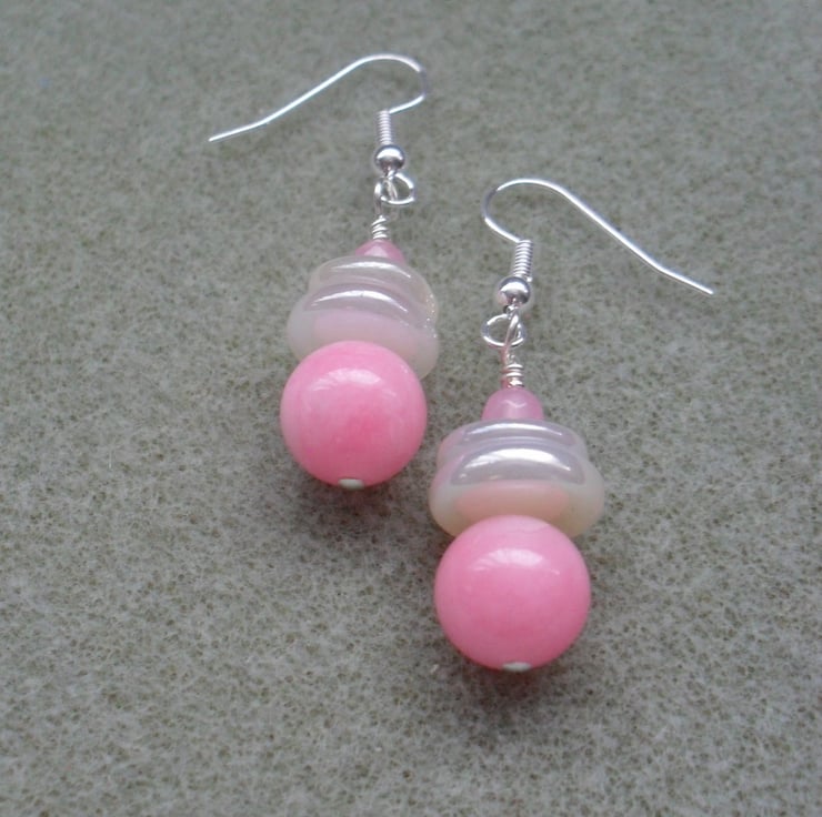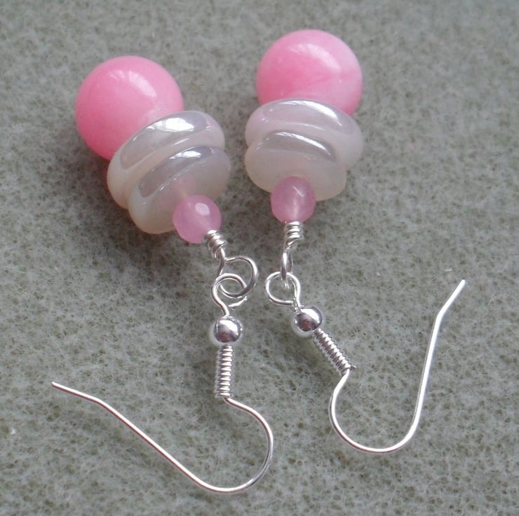 Pink dyed quartz and pearl coated chalcedony semi precious gemstones are attached to silver plated ear wires
