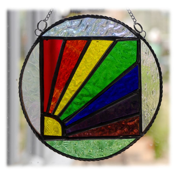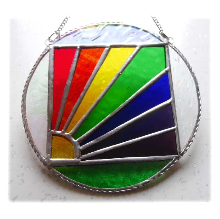 It is a striking 'picture' of a rainbow fanning up from a bright yellow sun. Above the rainbow is blue sky, beneath, the green grass which grows so fast in weather like this and at one sides, clear iridised raindrop glass and at the other a frosty glass. A very typical English summer's day weather. .
