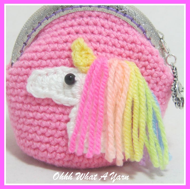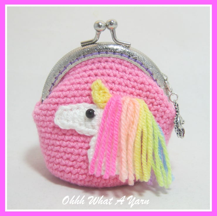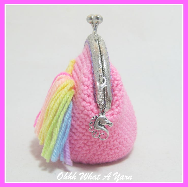 Crochet, crocheted pink pastel rainbow unicorn coin purse.