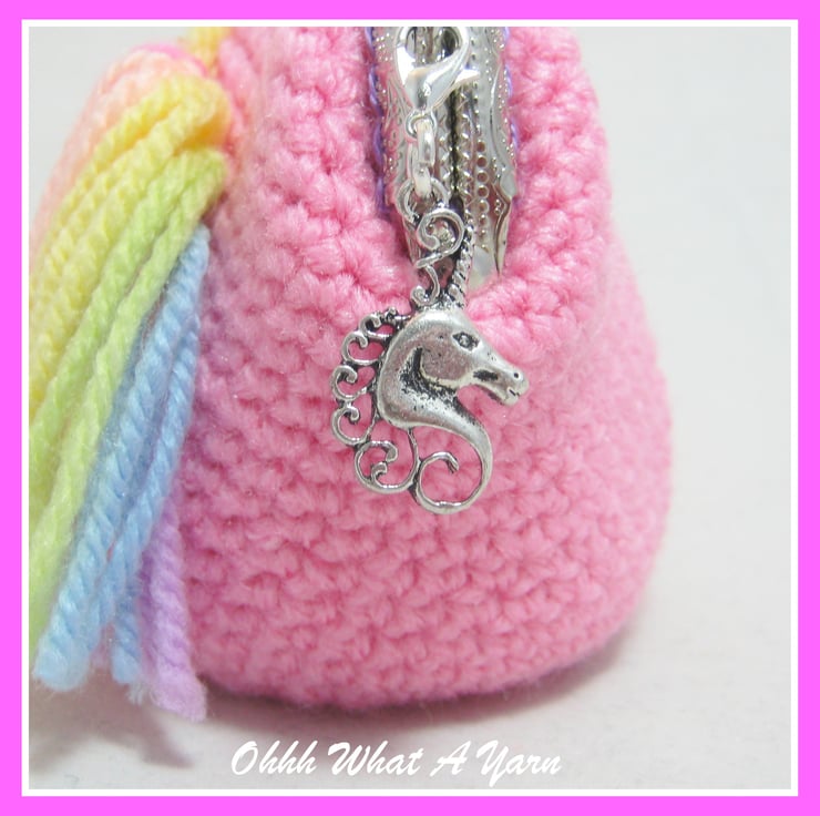 The purses comes complete with a detachable silver tone unicorn charm.