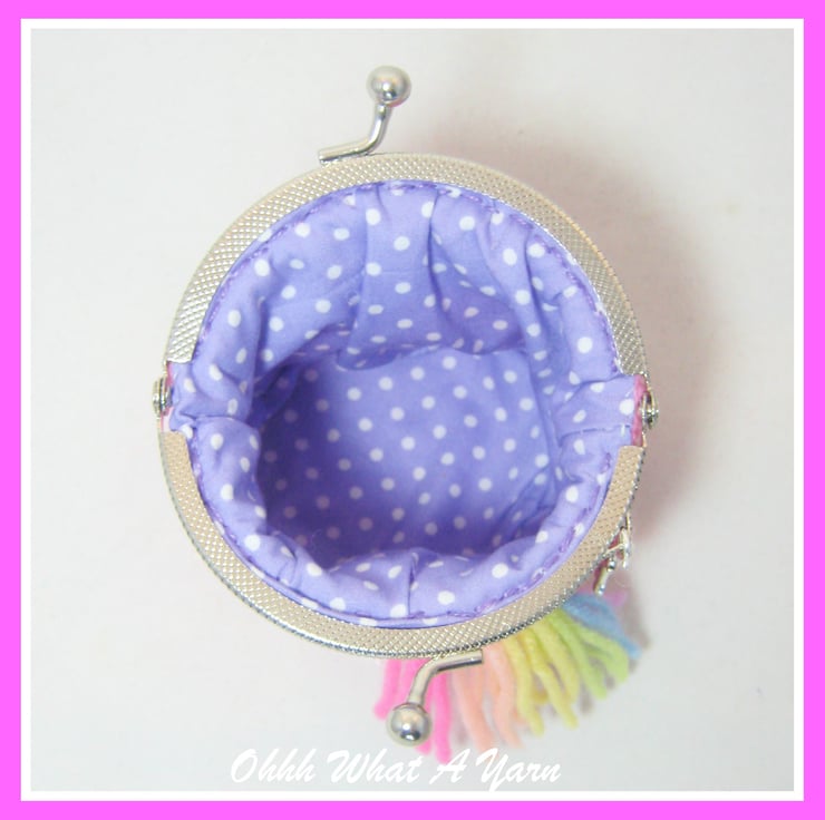 Crocheted using 100% acrylic yarns. The purse has a lilac/purple polka dot cotton lining and has a 8.5cm kiss clasp.