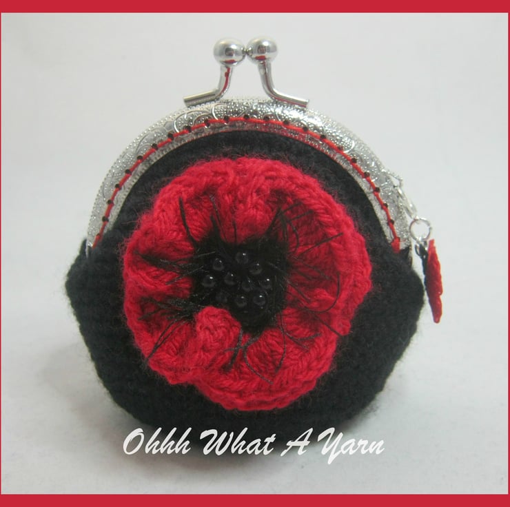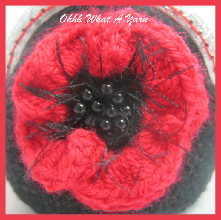 The crocheted poppy flower applique has been hand beaded in the centre and it has a crocheted thread poppy charm