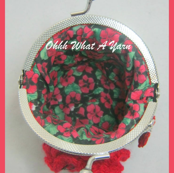 It has a beautiful coordinating cotton poppy print fabric lining.. The purse has a silver tone 8.5 cm kiss clasp and measures approximately 11 cm high and 11 cm wide.