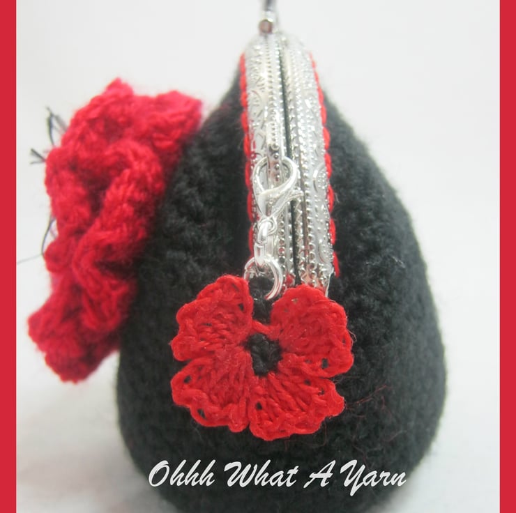 The stunning purse is crocheted in black and red 100% acrylic yarn.