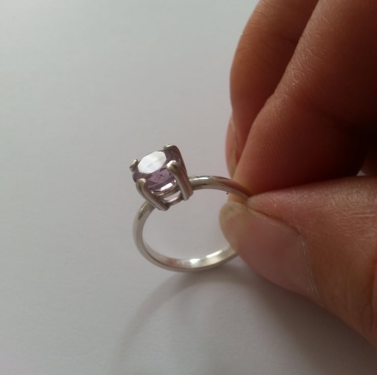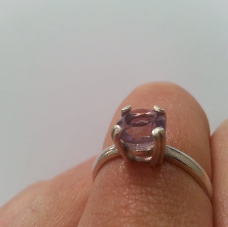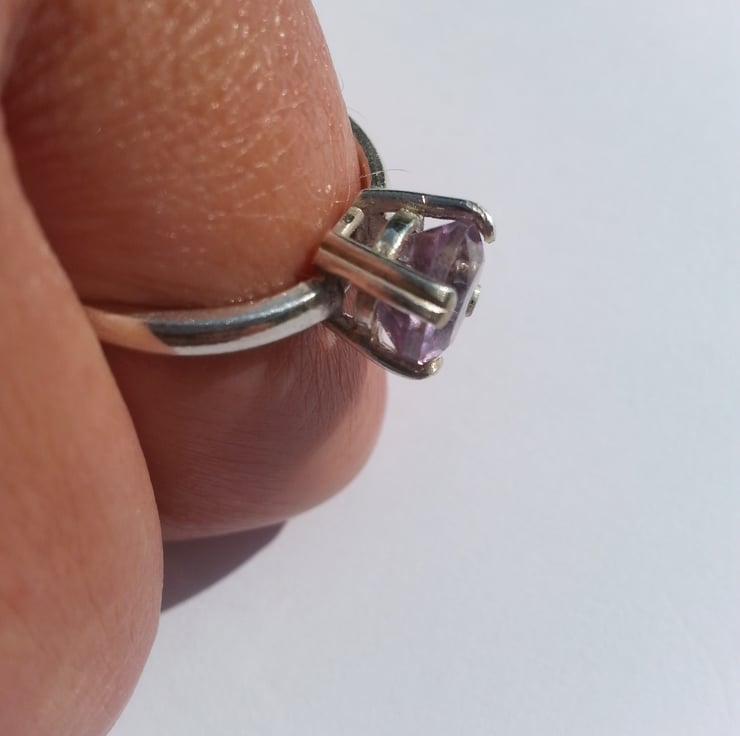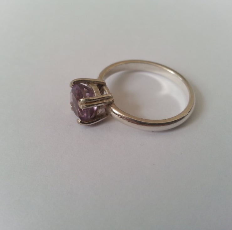 The size of this ring falls between a M and an N . The ring shank and setting have been made entirely by hand and contains a lovely 7mm faceted natural Amethyst.