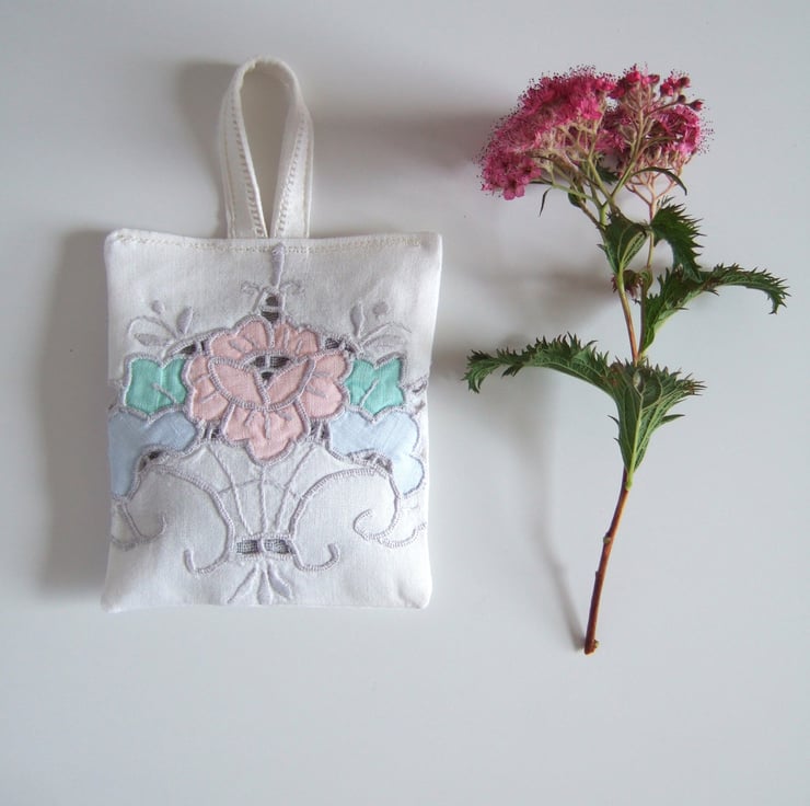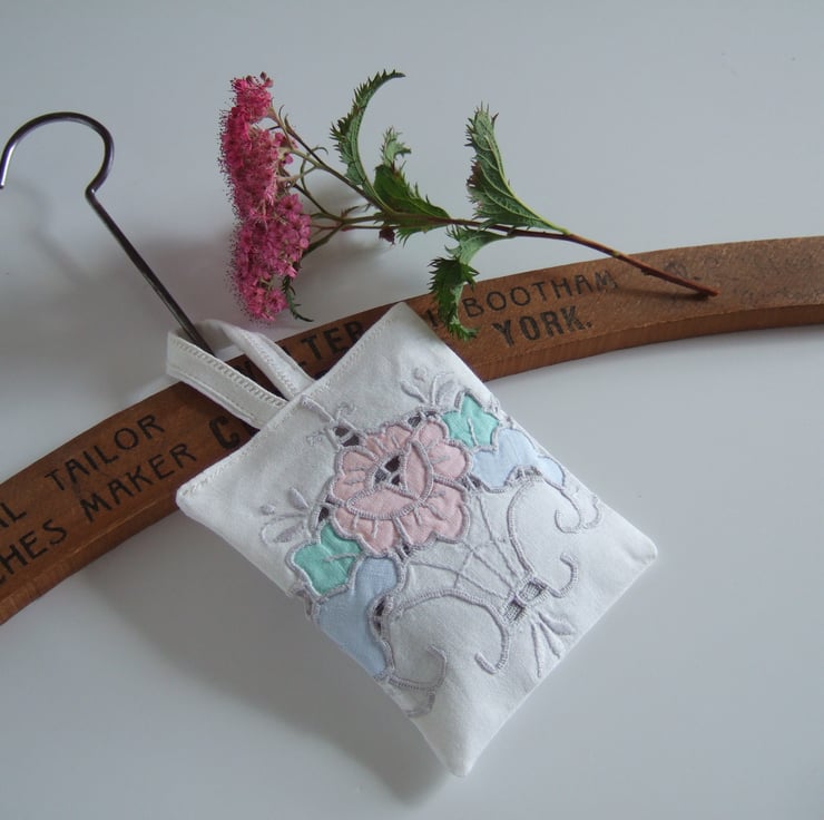 A sweet embroidered vintage fabric, make this a very pretty lavender bag indeed. It is made from a corner of a piece of old table linen with cut out designs, and is in a softly washed pale palette of pink, green and blue.