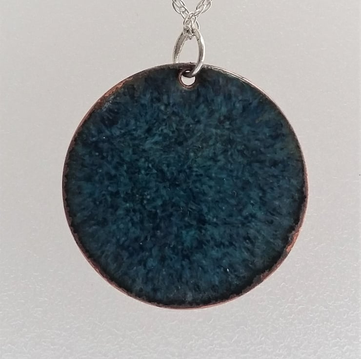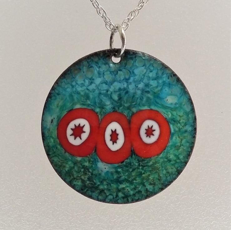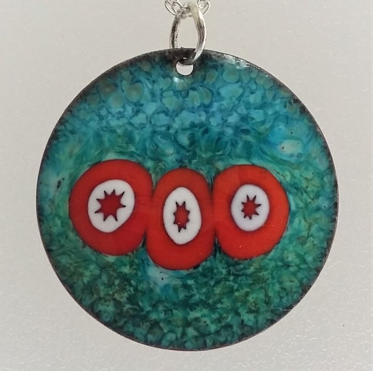Round enamelled copper pendant in blues and greens, with three orange and white millefiori inserts. The pendant has been kiln-fired and measures approximately 30mm in diameter. The back has been enamelled to give a lovely dark blue tweed effect. It comes complete with an 18” sterling silver rope chain with a soldered sterling silver jump ring and is supplied with a little organza pouch. POSTAGE IS FREE!