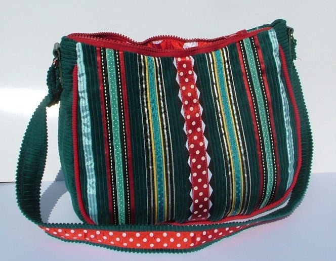 The back is a chunky emerald corduroy which has been overlayed with an assortment of patterned and plain ribbons. this panel has also been piped in a contrasting red corduroy.