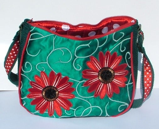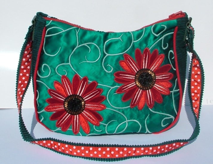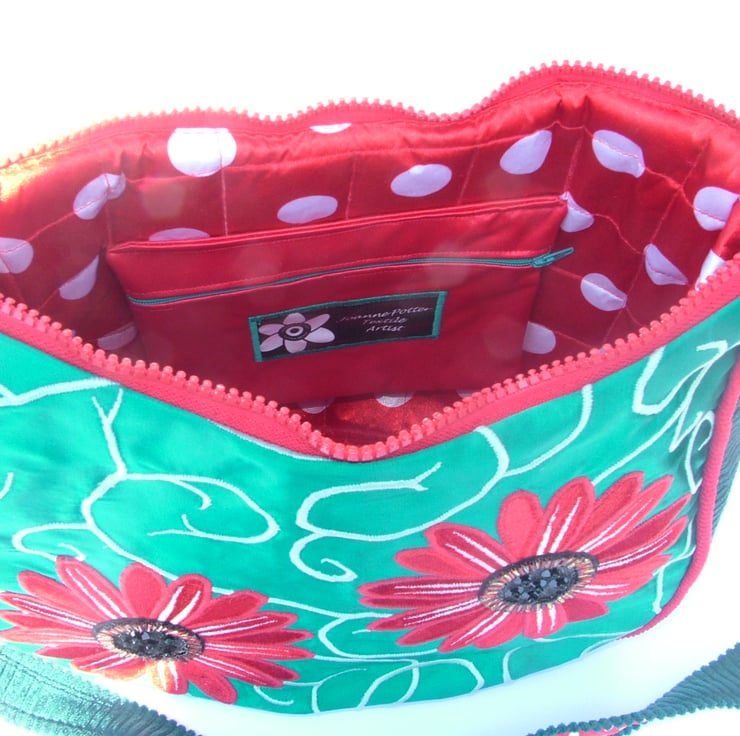 The front is a turquoise satin fabric that has been machine stitched with a lighter swirly pattern and then overlayed with red velvet appliqued flowers which have a handbeaded centre which have a resin finish to keep them inplace forever.