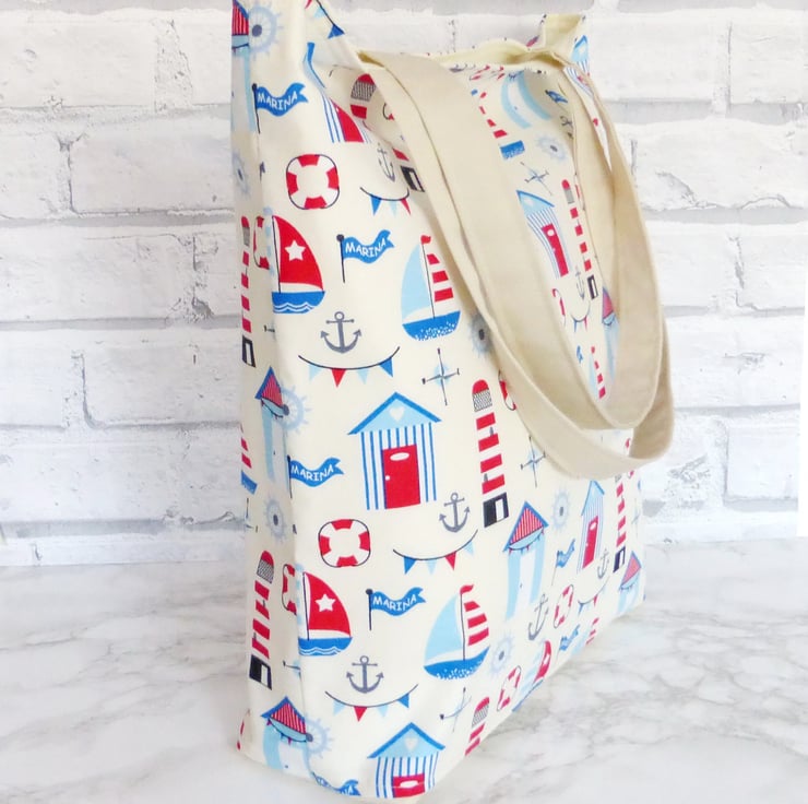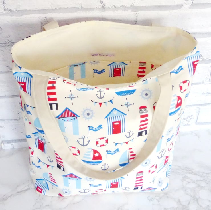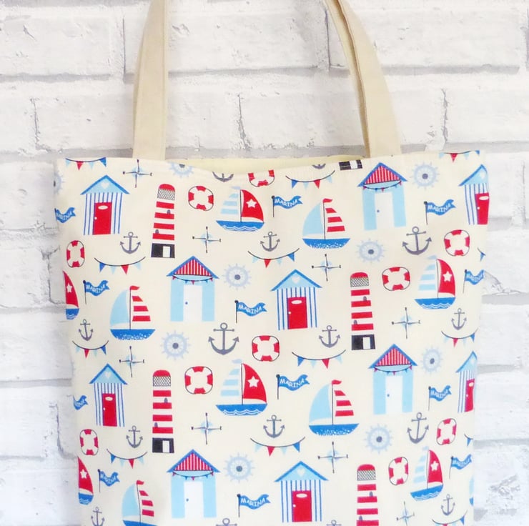A large sized beach bag/tote bag/shopping bag made from 100% cotton fabric with a beach hut design in reds and blues, on a cream background.