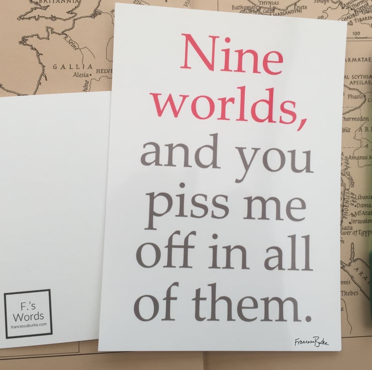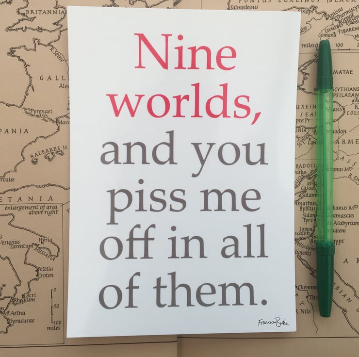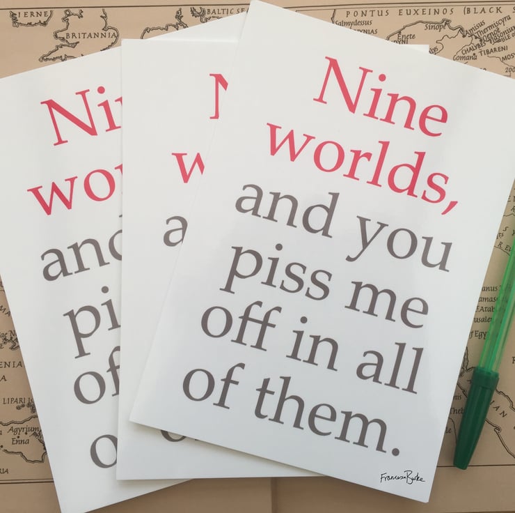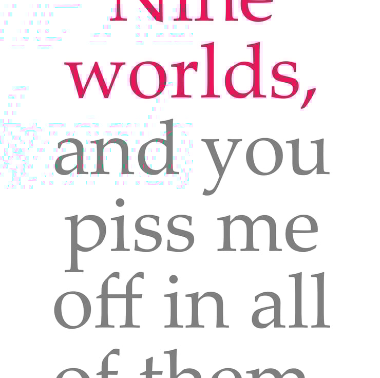 Print reads 'Nine worlds, and you piss me off in all of them.'