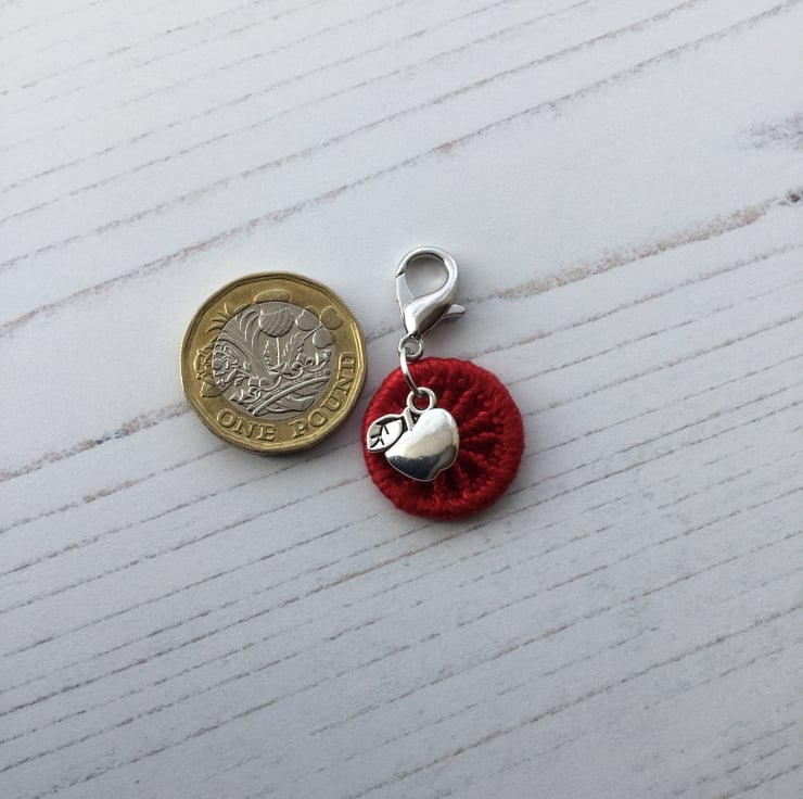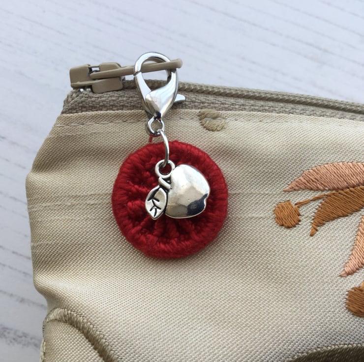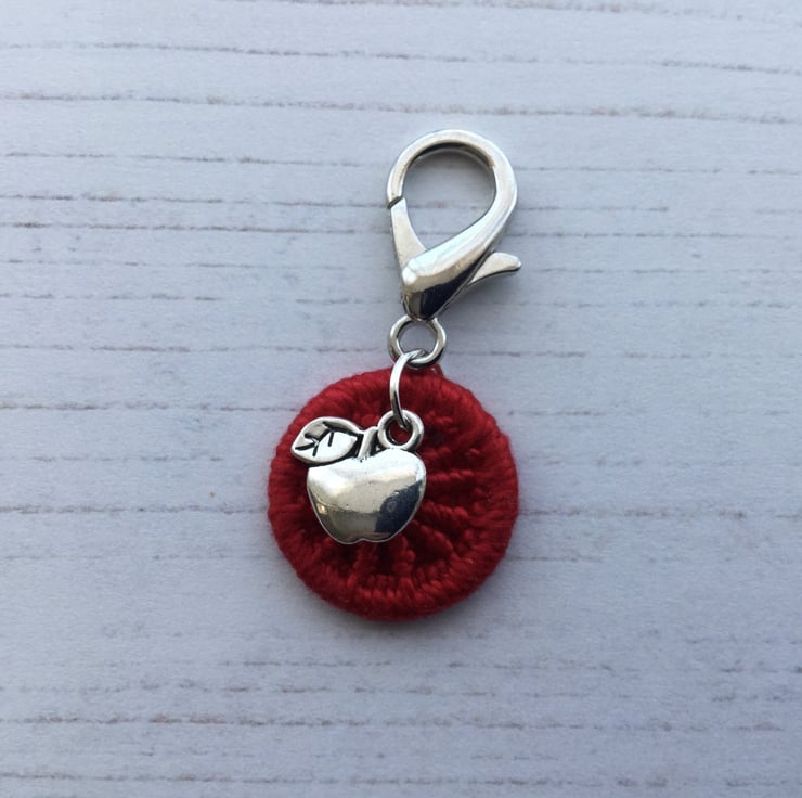 It is hanging together with a sweet little apple charm from a small lobster claw catch to enable you to attach it easily to a zip, bag or spiral bound journal or notebook.