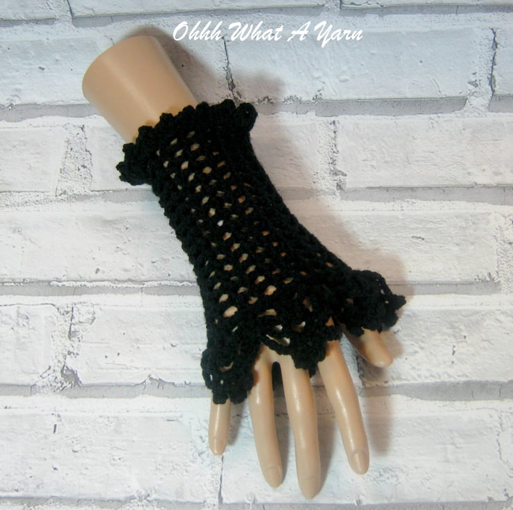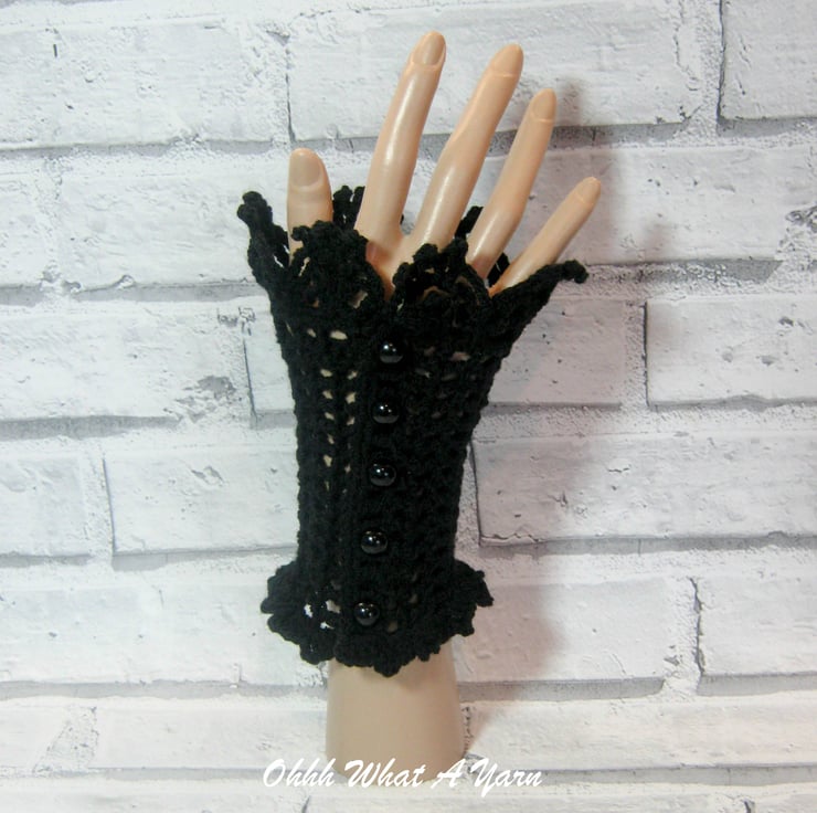 These beautiful fingerless gloves have a lace mesh pattern with a lacy trim at the top and bottom. They have a button up fastening with black dome buttons.