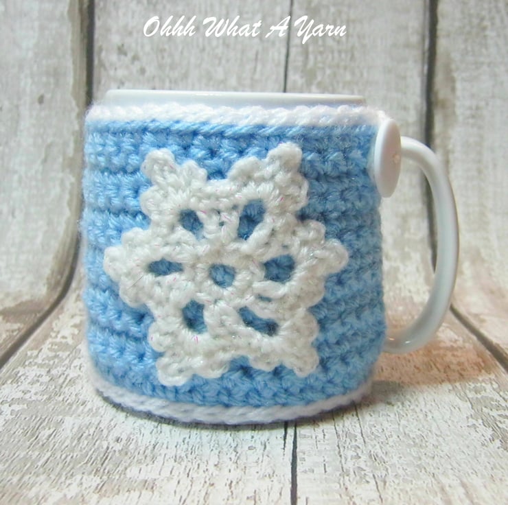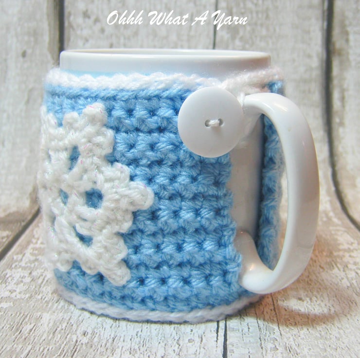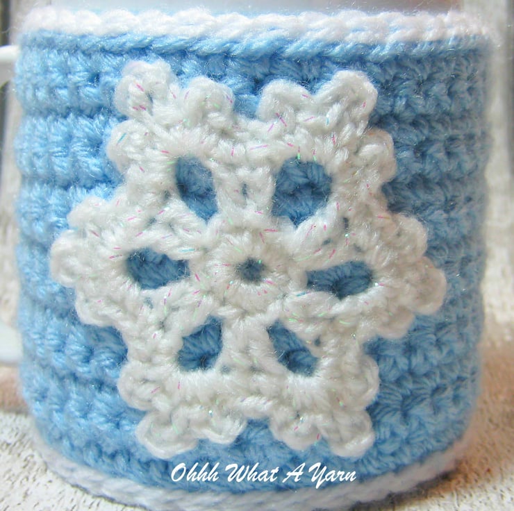 This pretty blue and white crochet snowflake mug hug is crocheted in 100% acrylic yarns.