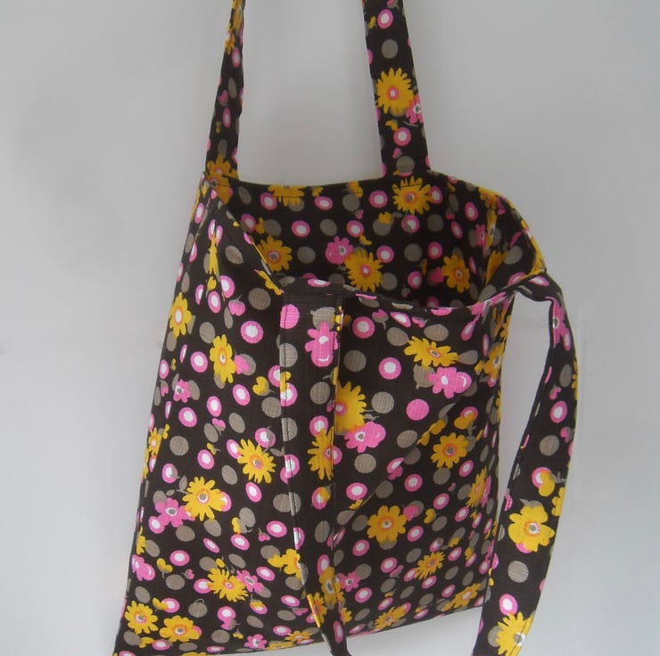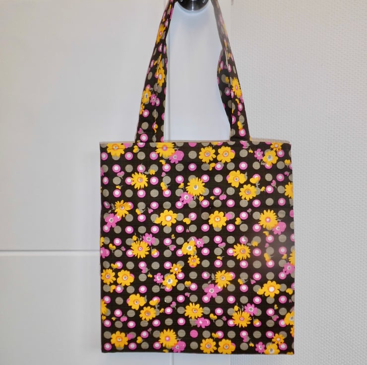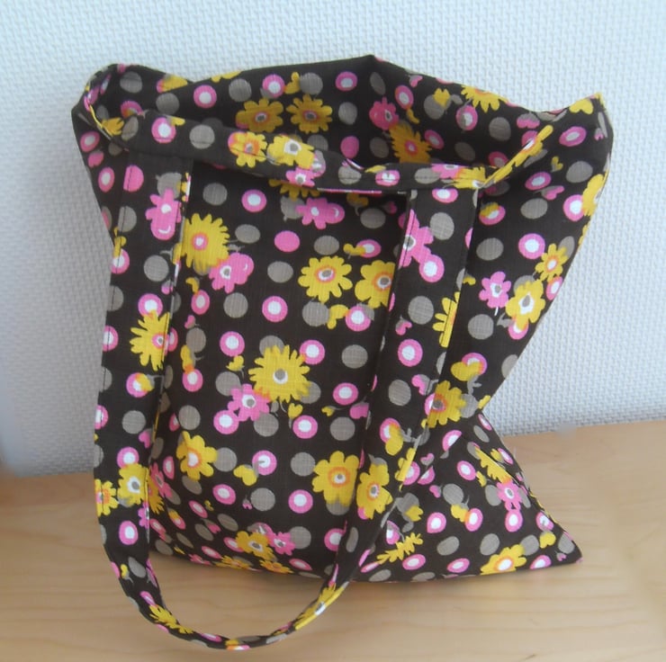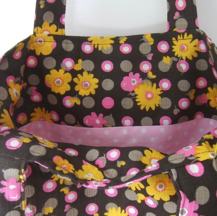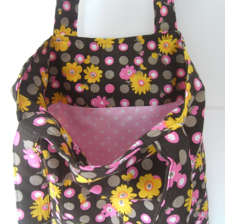 A basic tote bag made using a medium weight textured fabric which has a very dark brown background with bright pink and yellow flowery print. Inside is a facing with the outer fabric at the top and then the lower half is lined with pretty pink spotty cotton fabric.