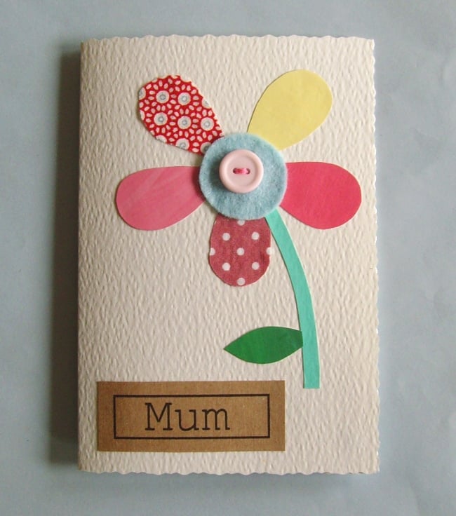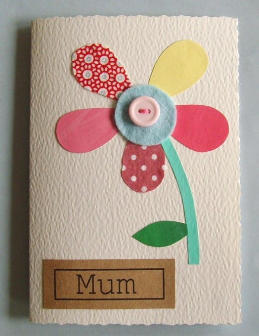 This Mother's day card is handmade from an original design with hand cut painted paper and fabric for the petals with a felt center for the flower. The stem and leaf is cut from painted paper and the flower is finished off with a hand sewn vintage button