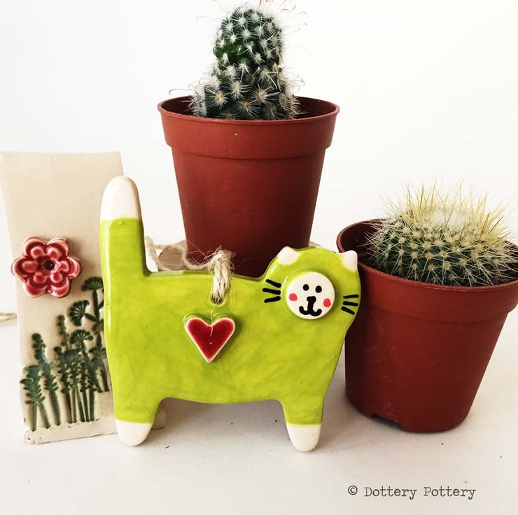 This cute little pottery cat decoration is made from white earthenware clay and decorated in bright, bold glaze. it hangs from a brown string and measures 7cm high by 7cm wide by 1cm deep. Glazed on the front, plain cream clay colour on the back.