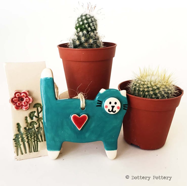 This cute little pottery cat decoration is made from white earthenware clay and decorated in bright, bold glaze. it hangs from a brown string and measures 7cm high by 7cm wide by 1cm deep. Glazed on the front, plain cream clay colour on the back.The last two photographs will not be the cat that you receive, they are there to show the back and scale of your decoration.