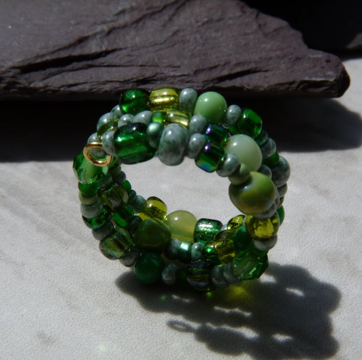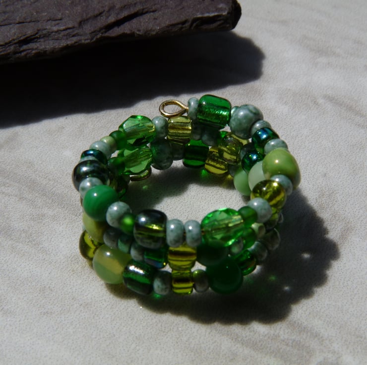 Green Beaded Memory Wire Ring, Boho Festival Ring