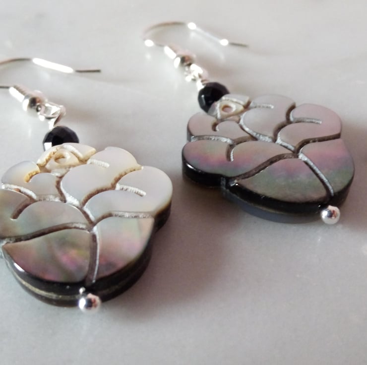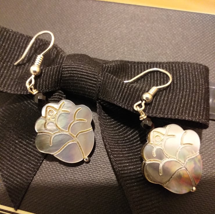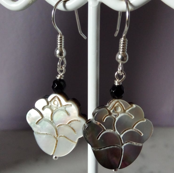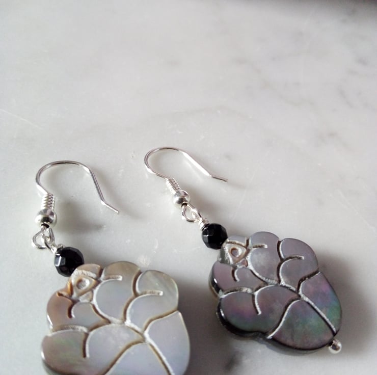 Lovely Black Shell Engraved Flower 20mm x 20mm with tiny black faceted agate hangs from Sterling Silver Ear wires.