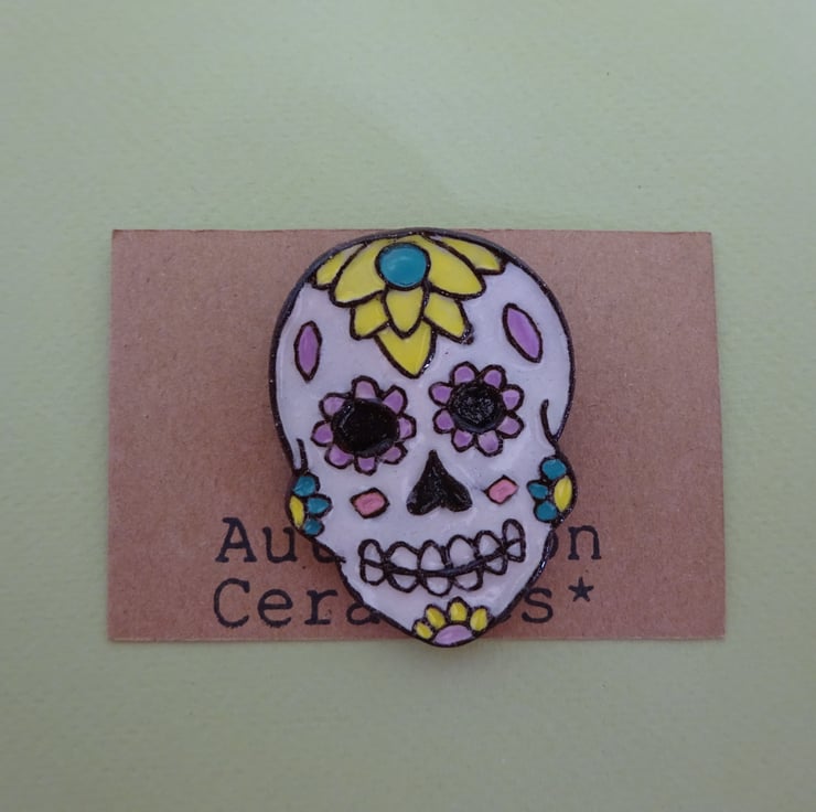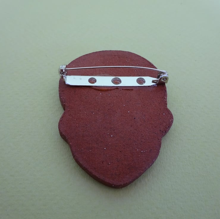 This brooch is handmade and designed by myself using a technique I have been developing. The clay is a dark chocolate terracotta with a white inlay that is then hand painted with under glaze. It has a clear glaze that make the colours more vibrant and rich.