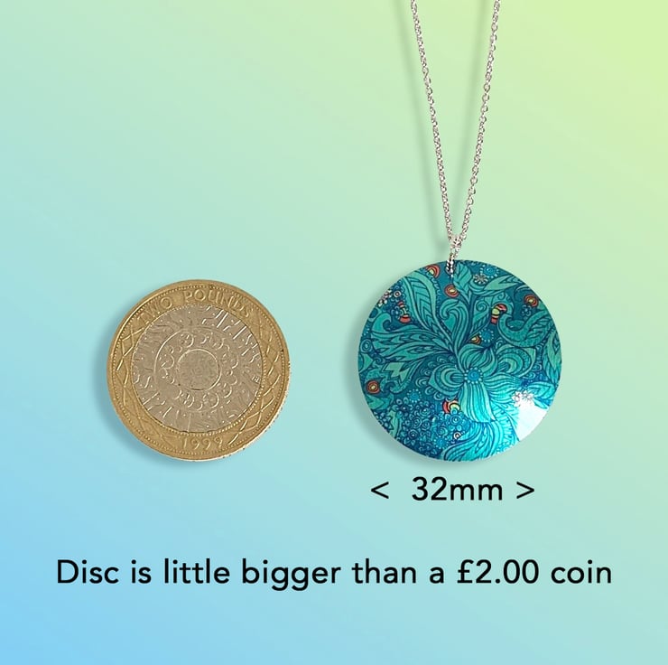 The pendant is 32mm diameter and the artwork is permanent, fade restistant and waterproof.