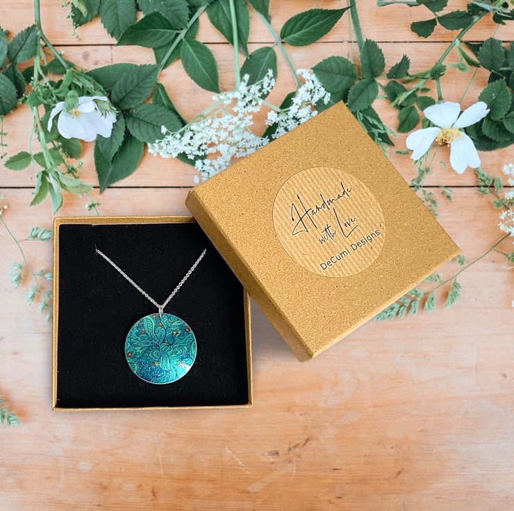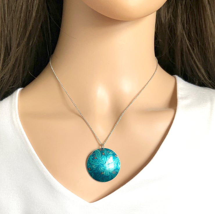 I made this pendant from aluminium, which I have hammered into a dome shape. You'll see that I've decorated it with a teal delicate floral pattern, and there is a choice of two chain lengths. Matching bracelets and earrings available, design 137