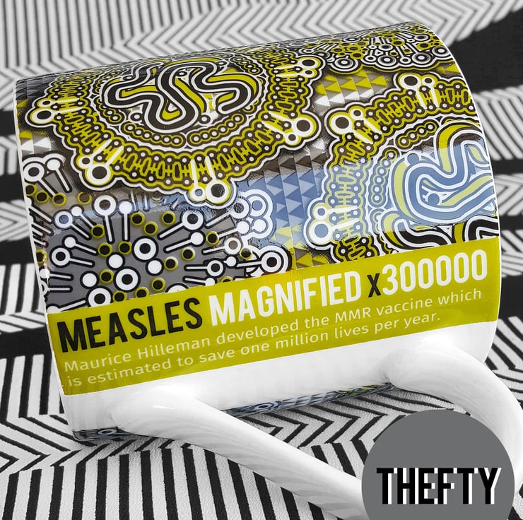 Science mug alert! This mug features an artist's colourful spin on the microscopic structure of the Measles virus.