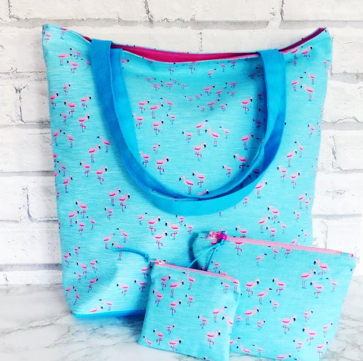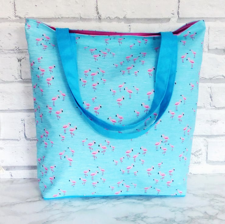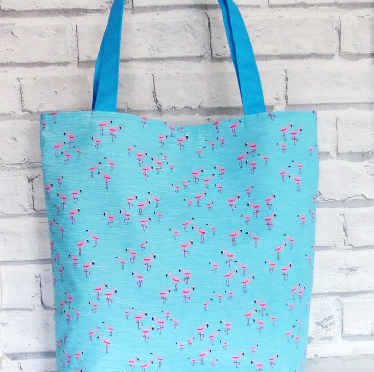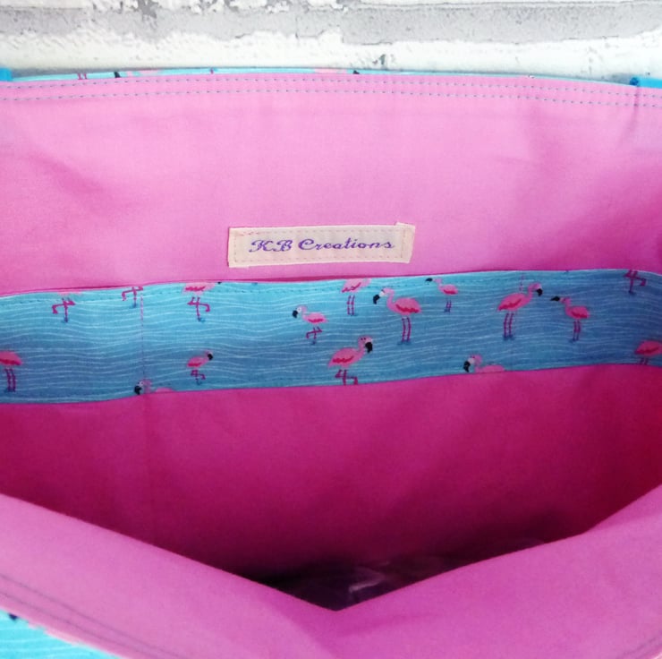 A large sized beach bag/tote bag/shopping bag made from 100% cotton fabric with a pink flamingo design, on a turquoise blue background. The lining is a plain pink cotton and Inside the bag are three slip pockets, ideal for your purse, shopping list, phone, keys etc.