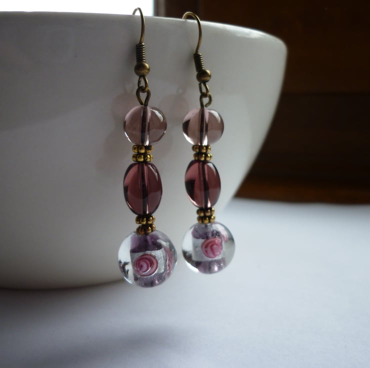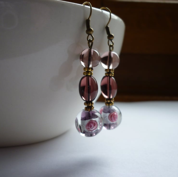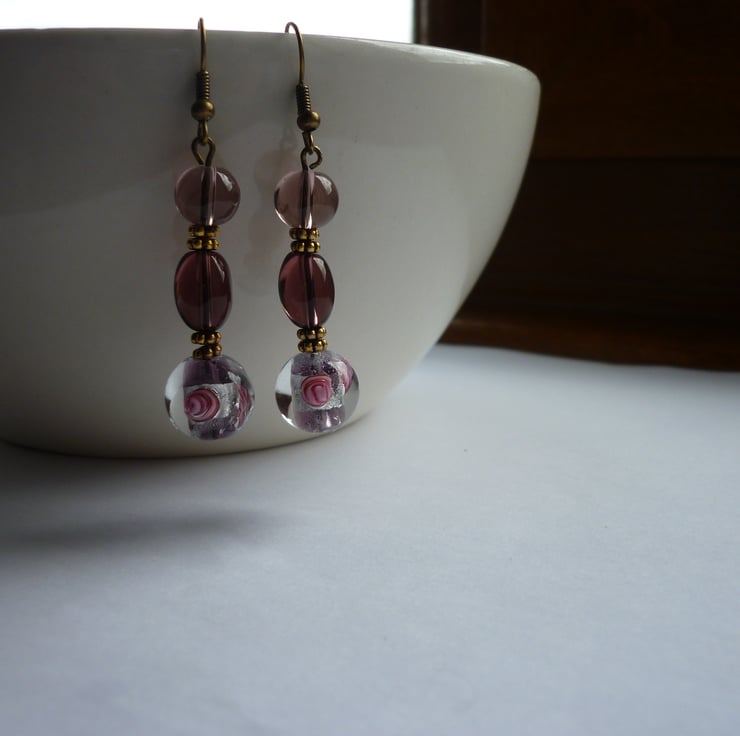 THE EARRINGS HAVE BEEN MADE WITH 12MM GLASS LAMPWORK BEADS AMETHYST,PINK AND SILVER WITH FLOWER WITHIN, OTHER BEADS USED ARE OVAL GLASS BEADS IN AMETHYST, SMALL GLASS BEADS IN PALE AMETHYST BRONZE DAISY SPACER BEADS, AND FINISHED WITH BRONZE FISH HOOK EAR WIRES.