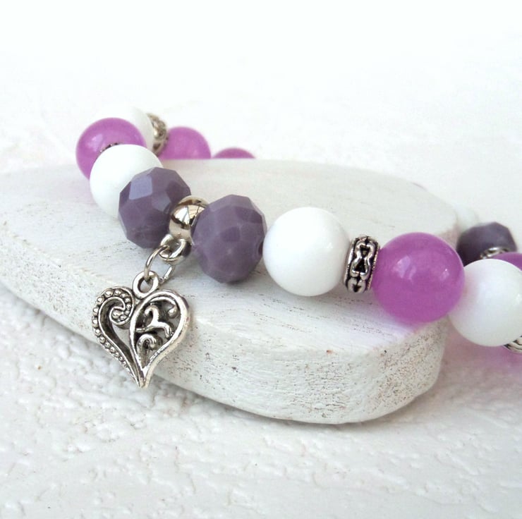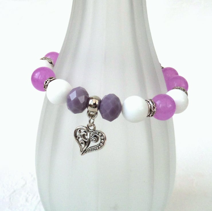 A chunky stretchy bracelet, made with 10 mm quartz, jade & crystal pink, white & purple beads.