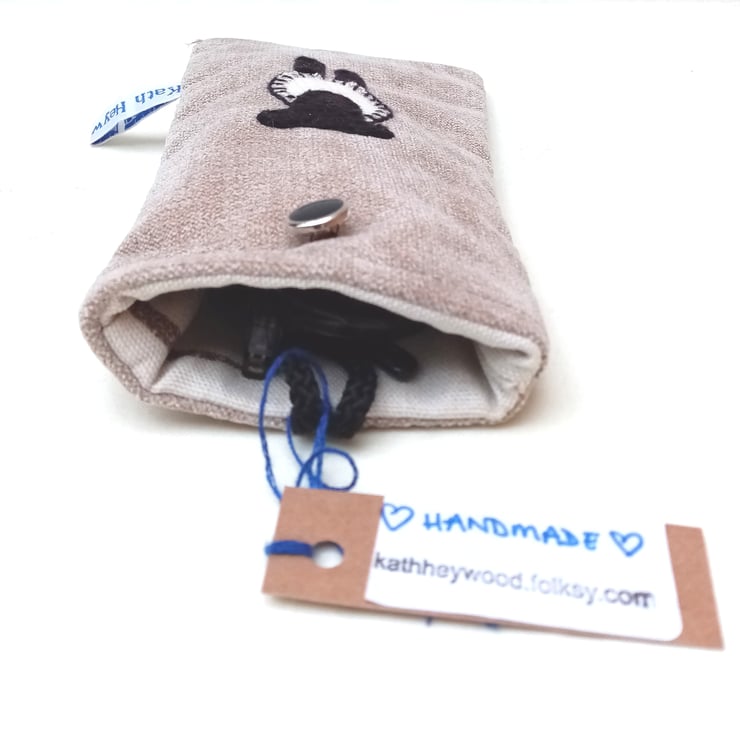This case is beige with cream lining and fastens with a black cord and a black vintage button.