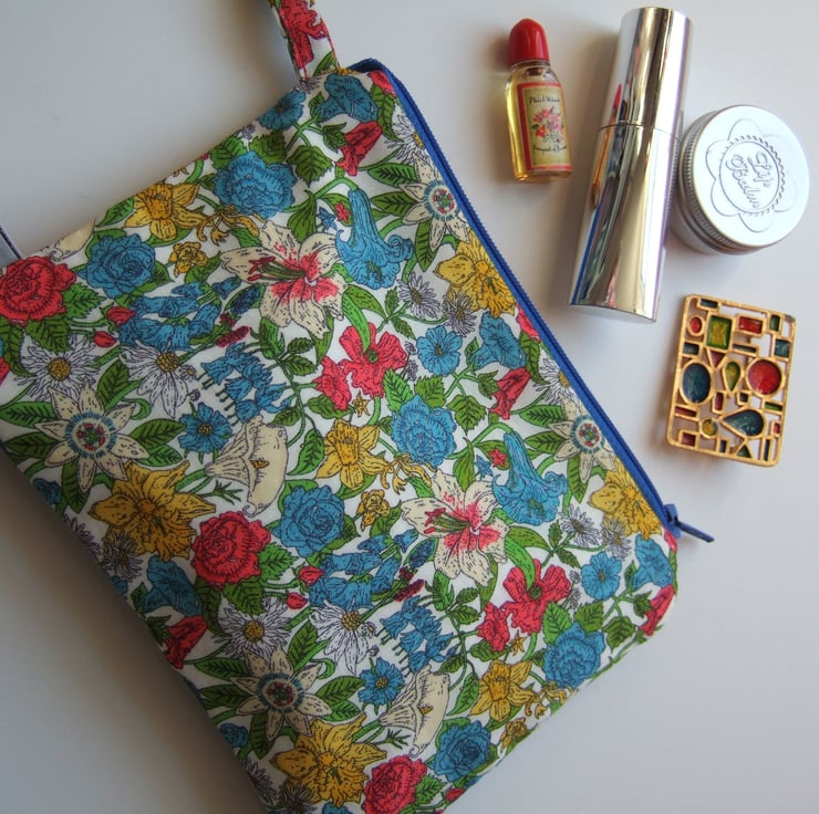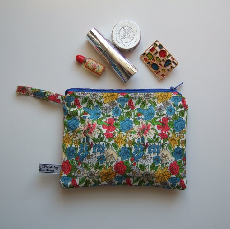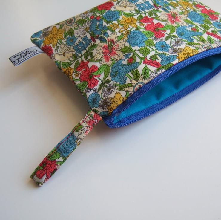 It closes with a bright blue zip measuring 16cm, and is lined in blue cotton.