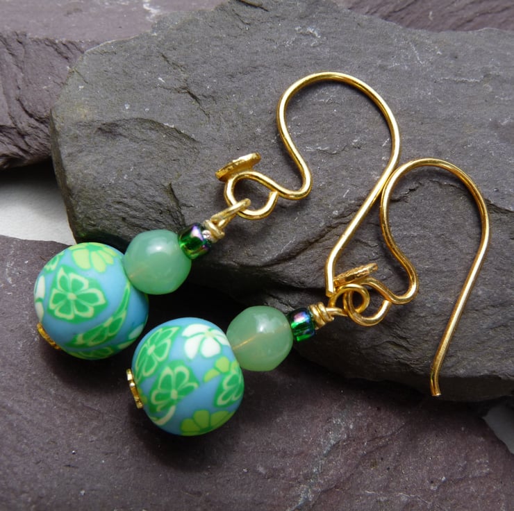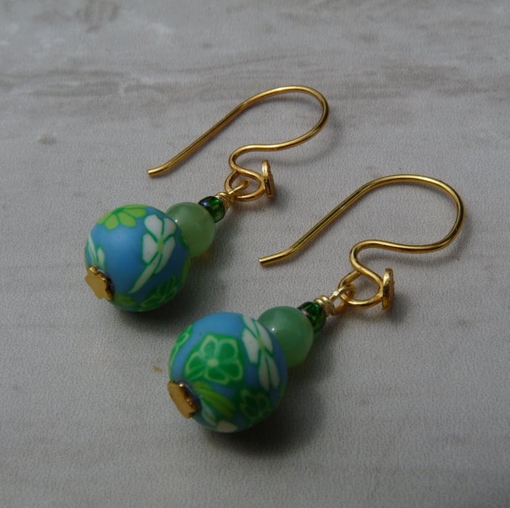 These fun beaded earrings are made using a mixture of glass beads, and a 10mm polymer clay bead as the focal point, all in shades of green. They have been finished using gold plated copper earring hooks.