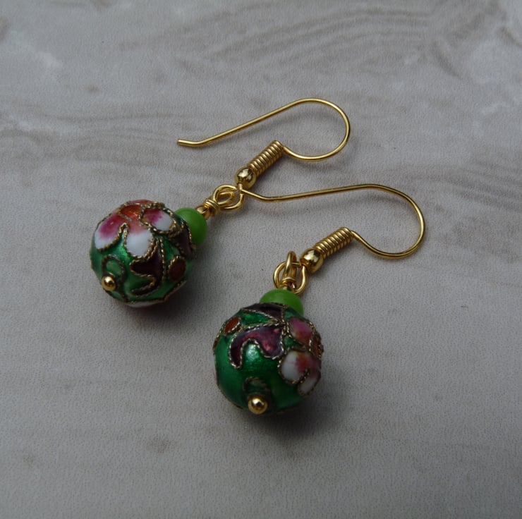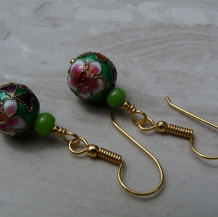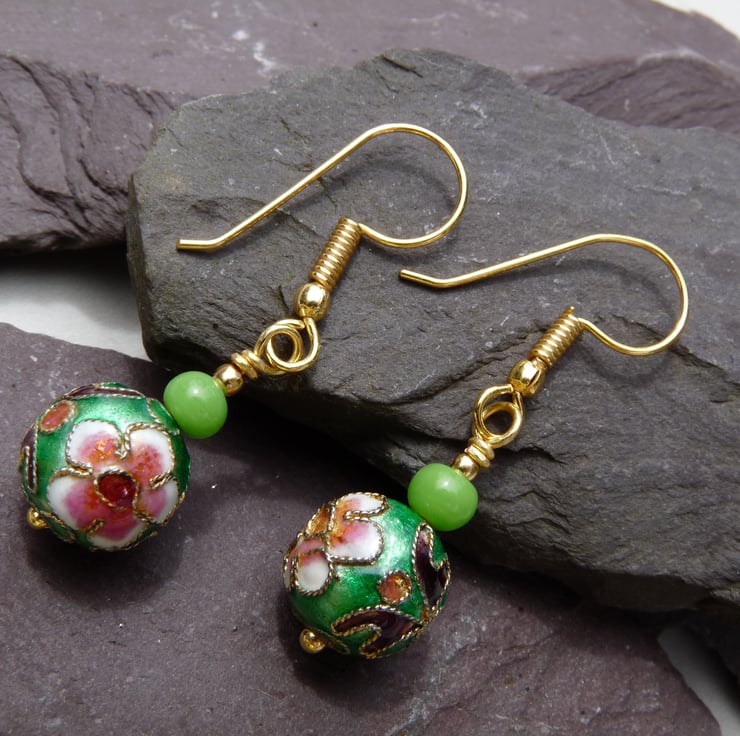 These beautiful beaded earrings are made using a mixture of glass beads, and a 10mm cloisonne bead as the focal point, in shades of green. They have been finished using gold plated copper earring hooks.