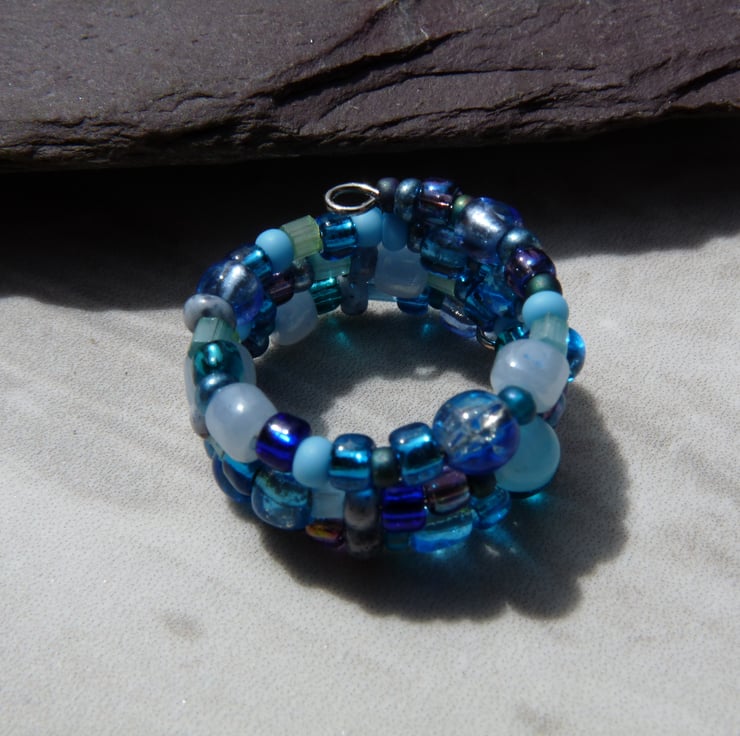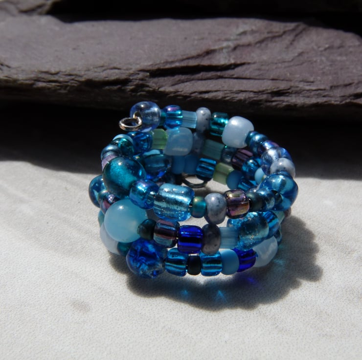 It has been made with a selection of glass beads in different shapes and sizes, with 2-4mm blue seed beads that have all been threaded onto silver plated memory wire.