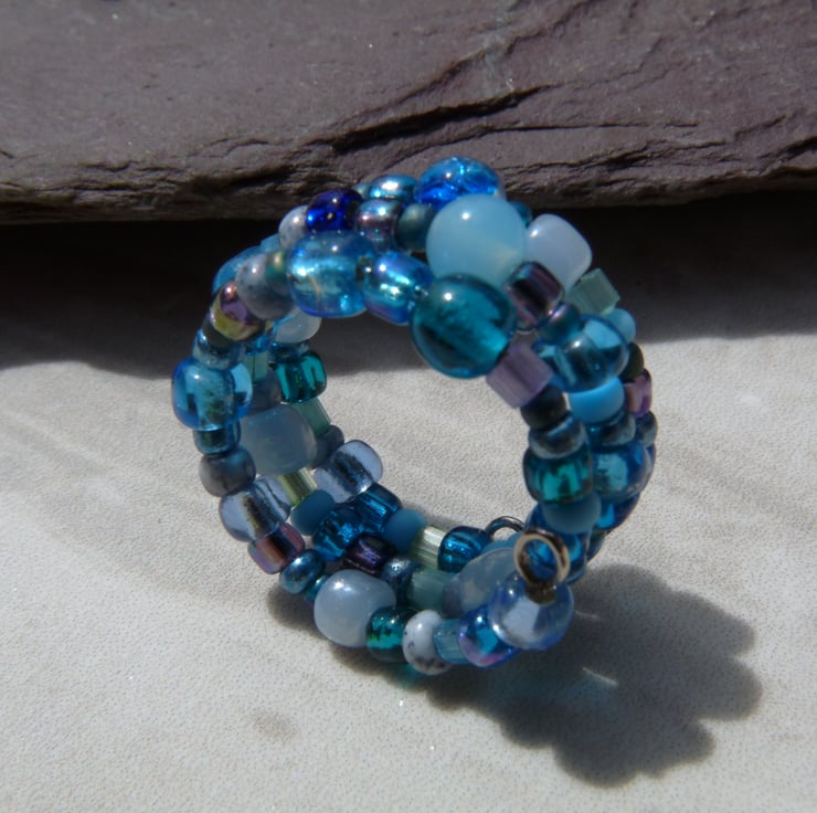 Blue Beaded Wire Ring, Boho Festival Ring