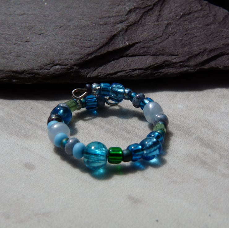 It has been made with a selection of glass beads in different shapes and sizes, with 2-4mm blue seed beads that have all been threaded onto silver plated memory wire.