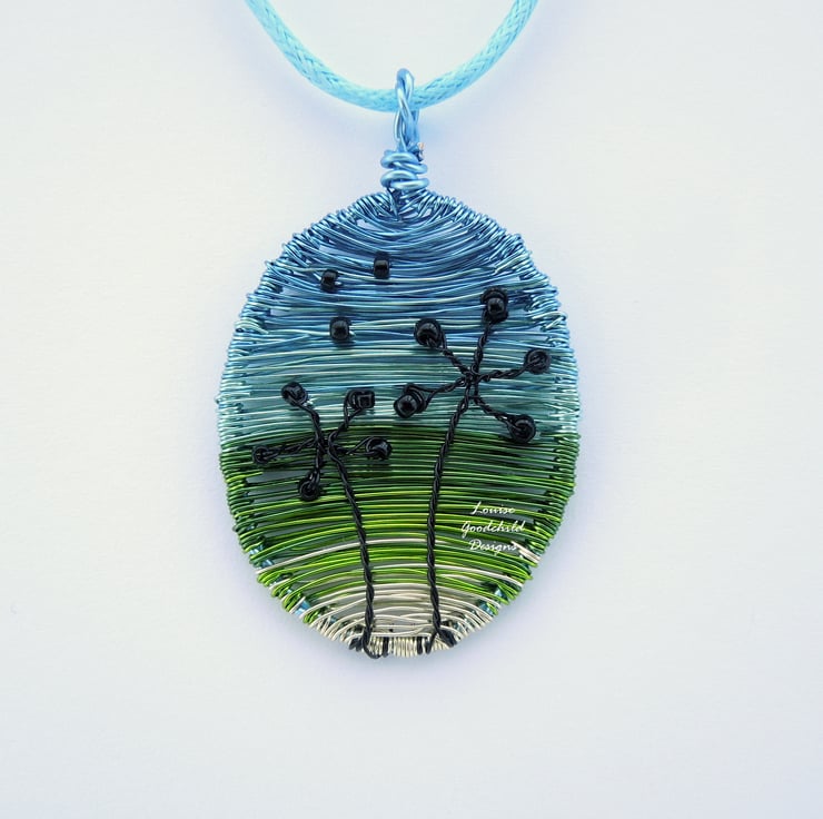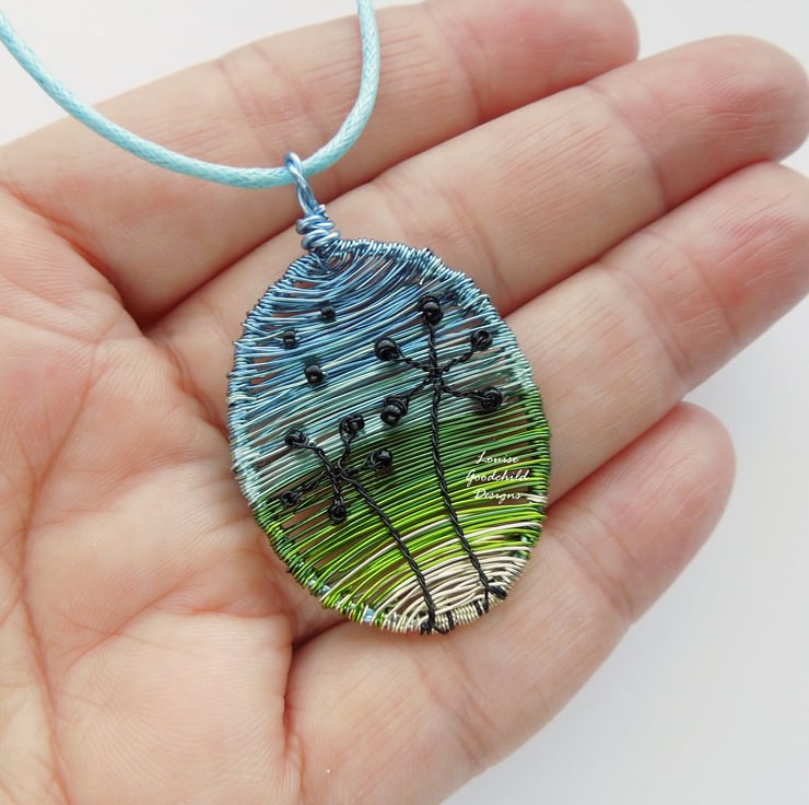 One of my signature woven wire pendants, depicting a dandelion silhouetted against a summer meadow, with seeds (or wishes) drifting off on the breeze.