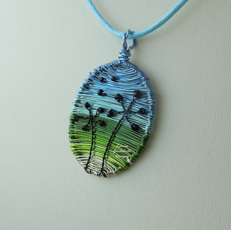 Made entirely from coloured copper wire and high quality glass seed beads, with a matching cotton cord necklace. Oval measures approximately 1 and 1/2" in length. Cord necklace approx. 17" plus 1 and 1/2" extender chain.