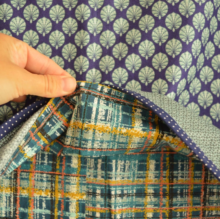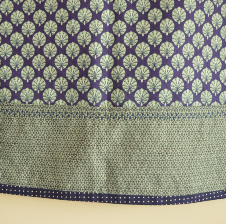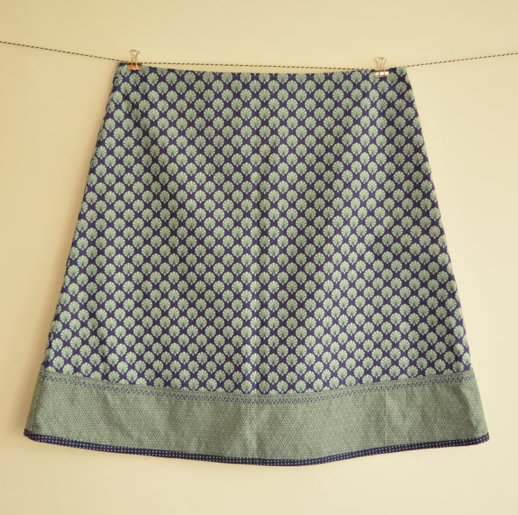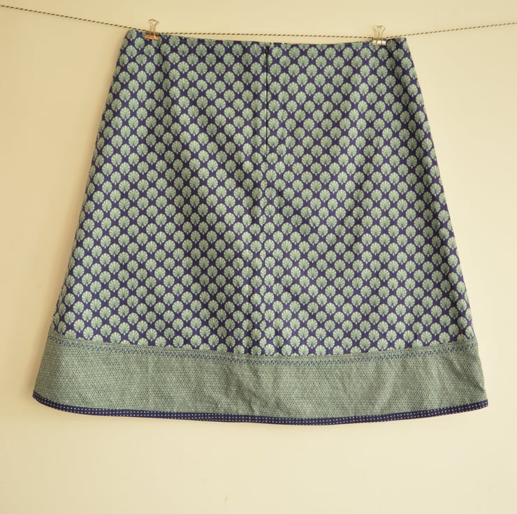 An A line skirt in contrasting blue and purple 100% cotton fabrics.