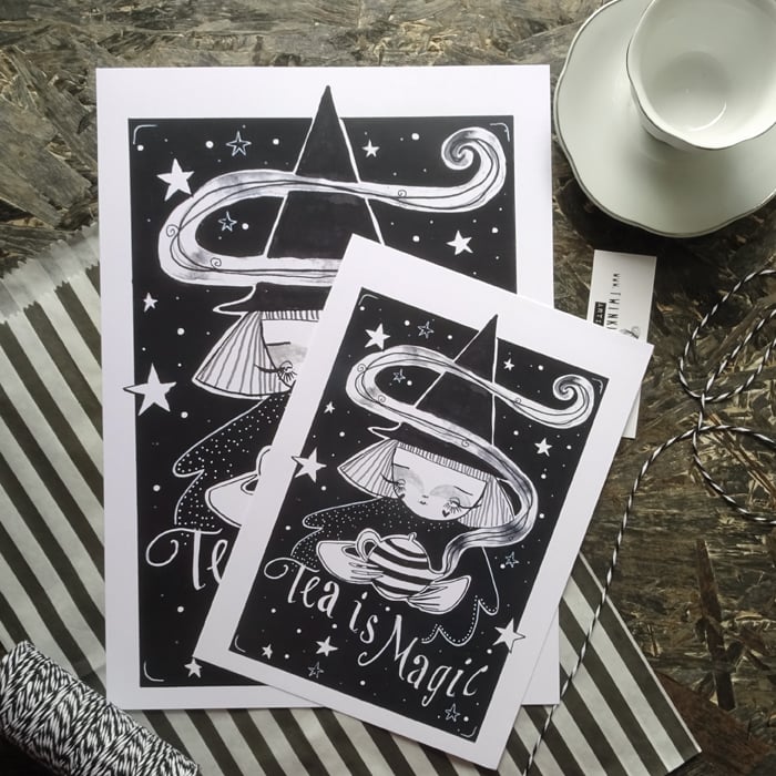 This print is for a gorgeous 'freak show' inspired poster, showcasing some a Tea loving witch.