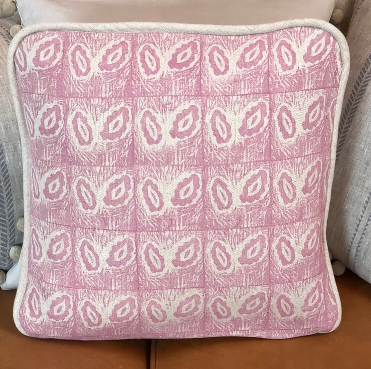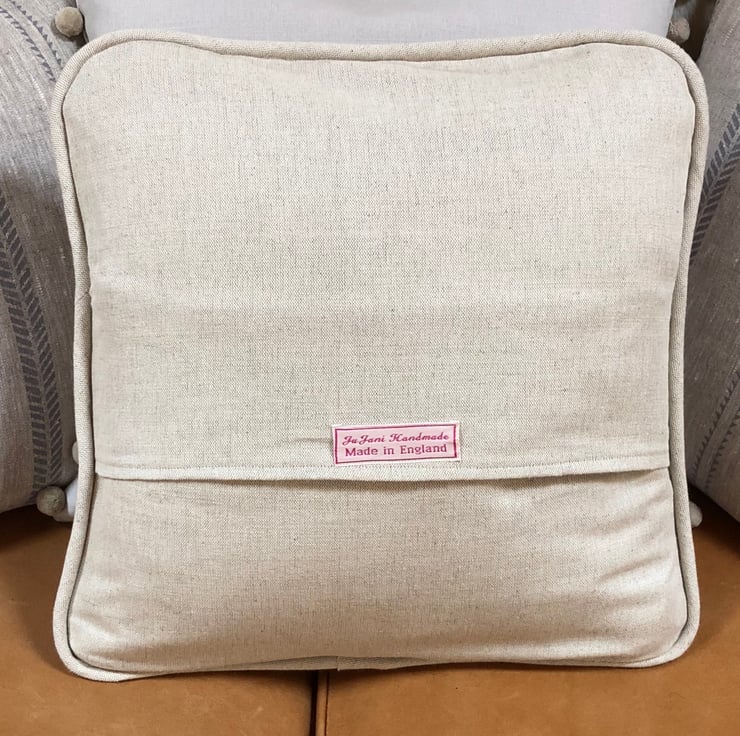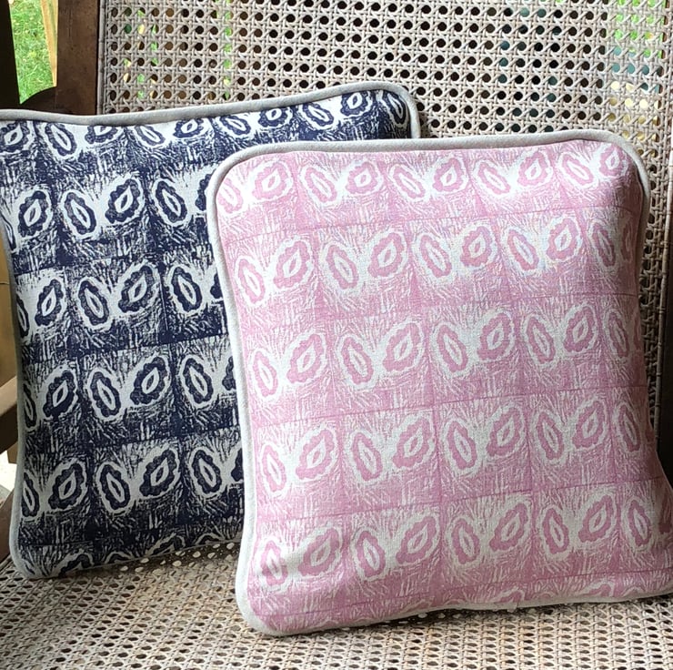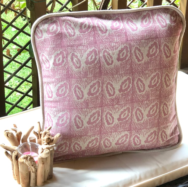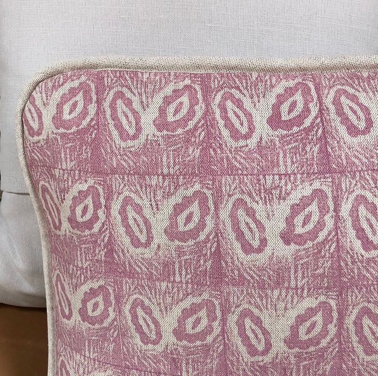 This attractive cushion has been made from a beautiful fabric that I have created by carving a lino block and hand printing the design on to a quality linen.The cushion has a deep envelope closure and a piped edging.All seams have been overlocked .A feather filled cushion insert is also included .