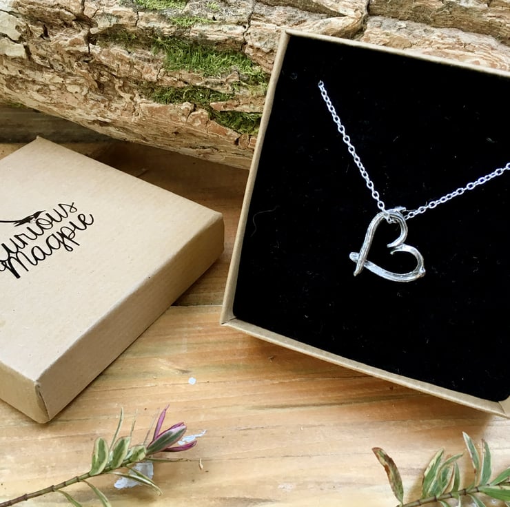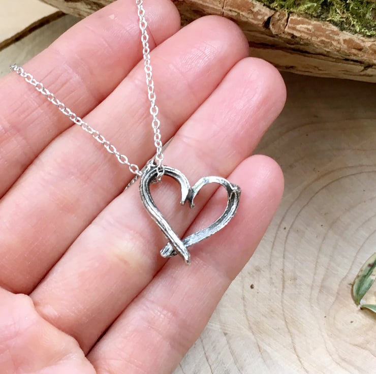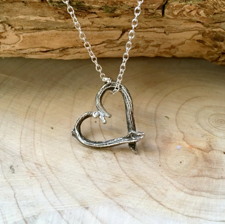 This beautiful necklace is handcrafted from a real twig, cast in solid sterling silver and formed into a heart shaped pendant.