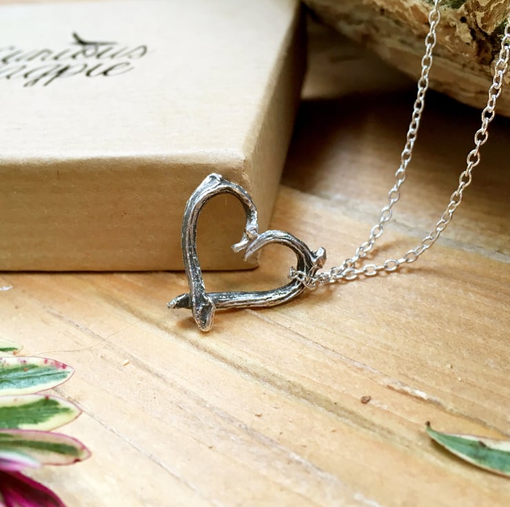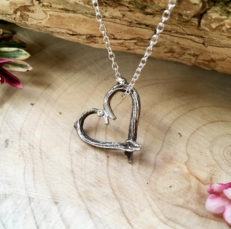 This beautiful necklace is handcrafted from a real twig, cast in solid sterling silver and formed into a heart shaped pendant.